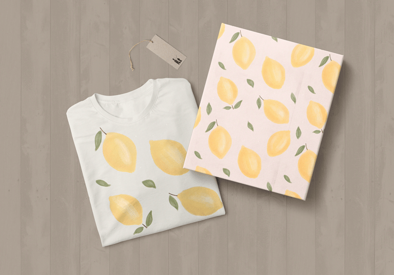 Lemon pattern design made on procreate with a watercolor brush. Mockups were made to represent the art application on t-shirts and packaging.