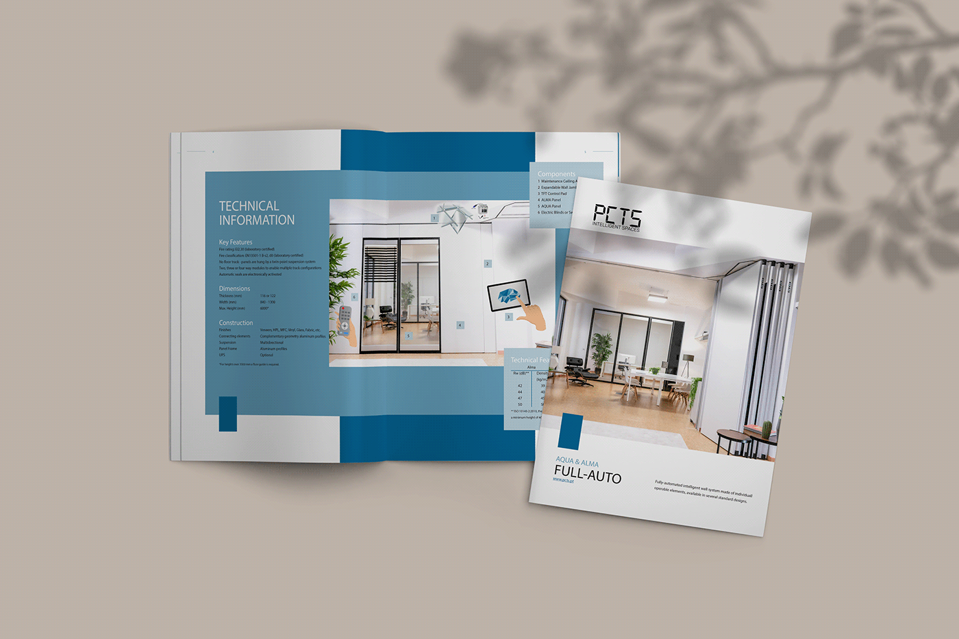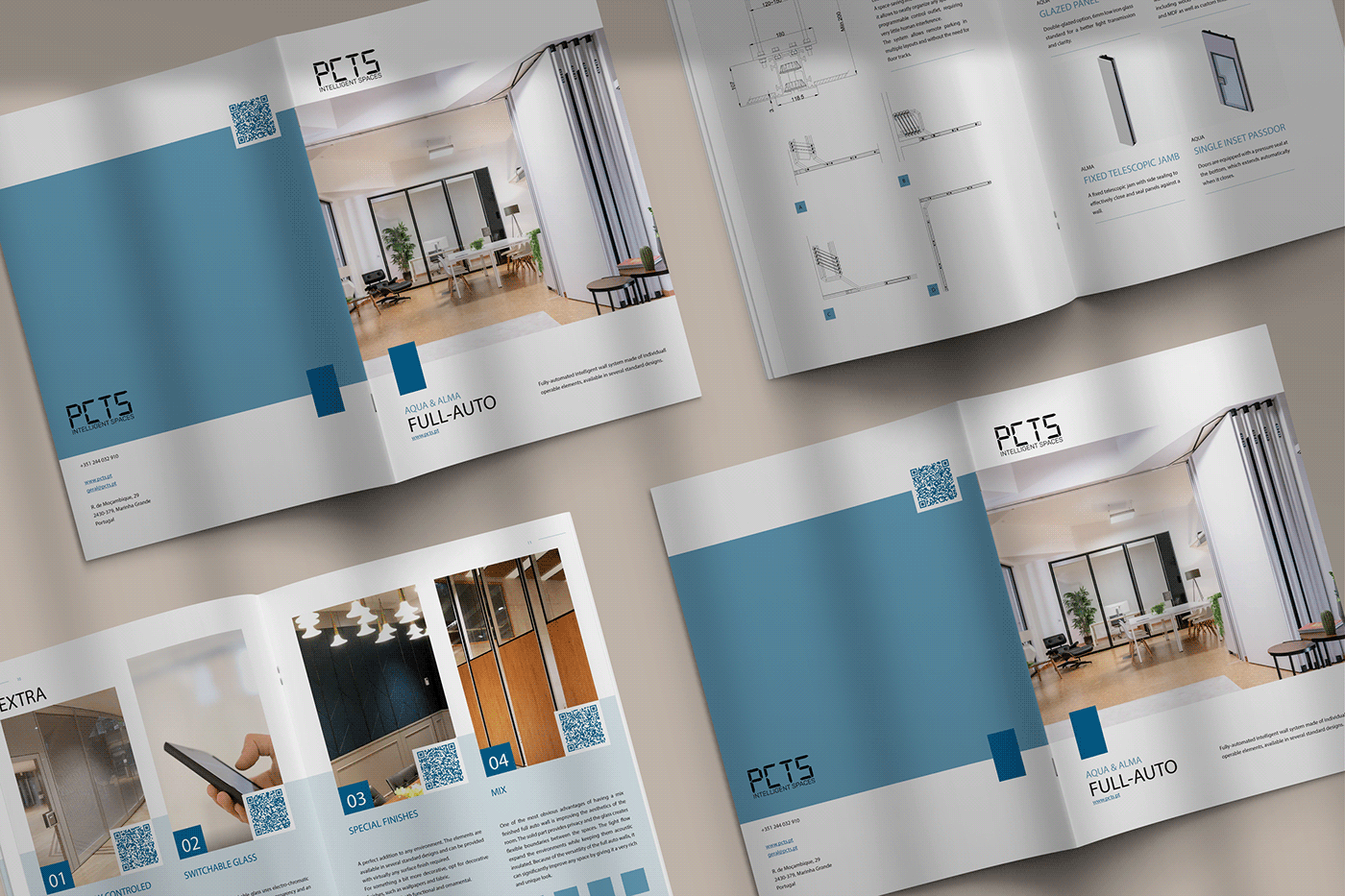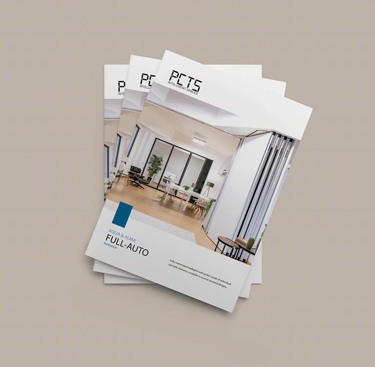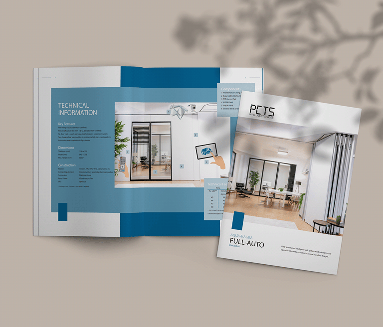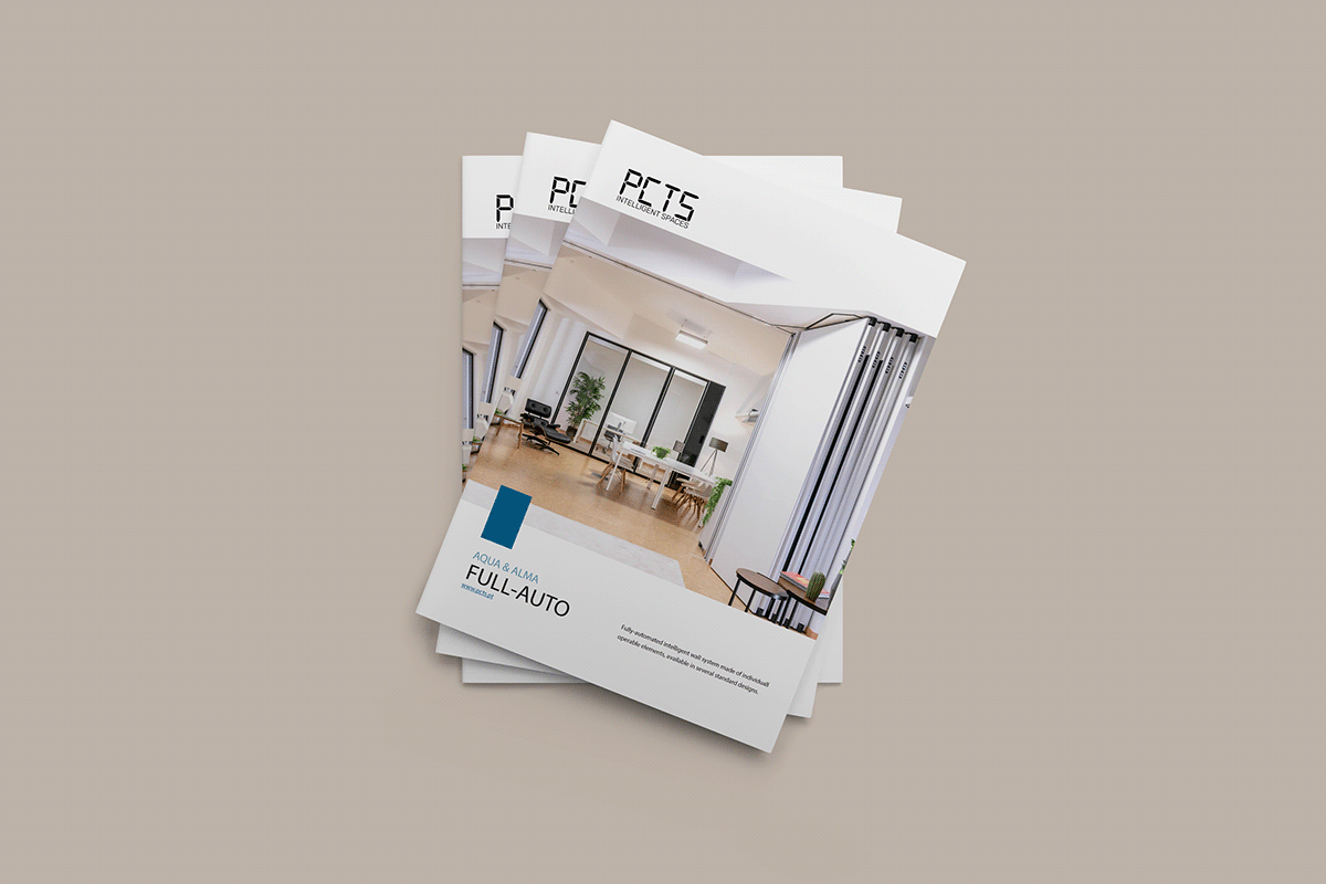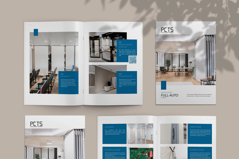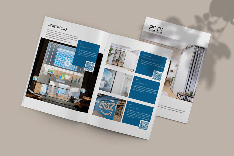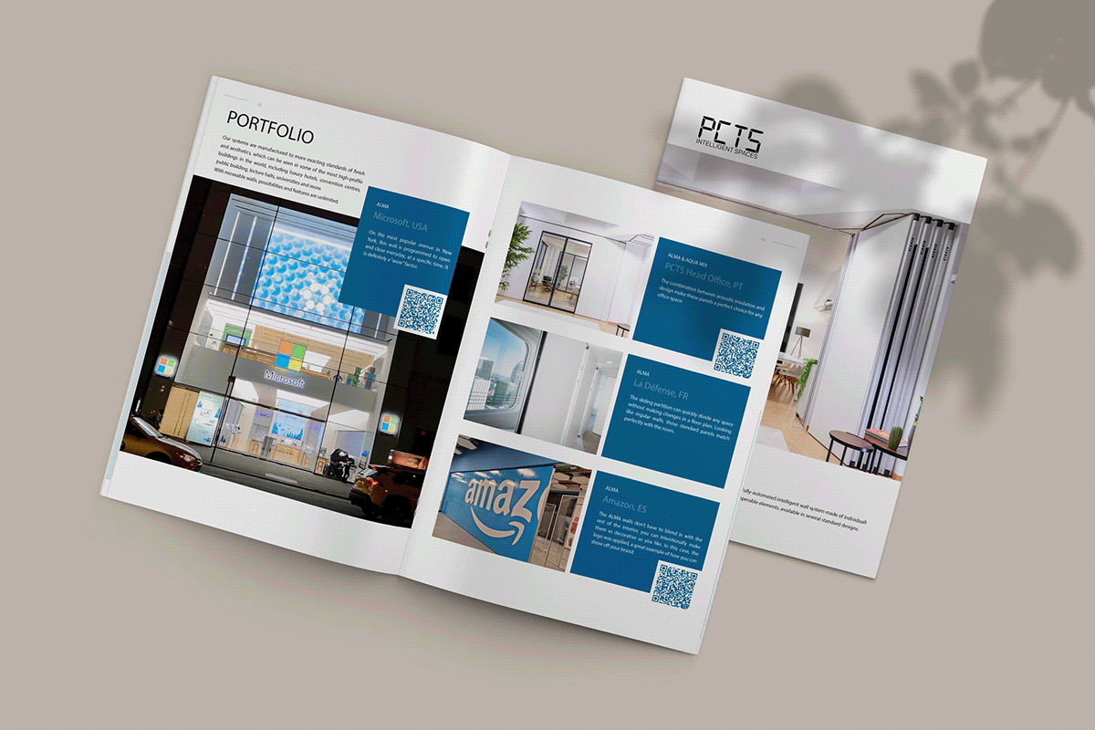 Criação de um novo catálogo para o produto mais avançado da PCTS: a parede móvel totalmente automatizada. As cores foram escolhidas de acordo com a identidade visual da marca, e as fotos utilizadas são de projetos reais realizados ao redor do mundo. Este catálogo foi desenvolvido em 2022, enquanto eu trabalhava como designer gráfico na empresa. Entre os clientes atendidos pela PCTS estão Microsoft, Amazon e o Governo do Reino Unido.